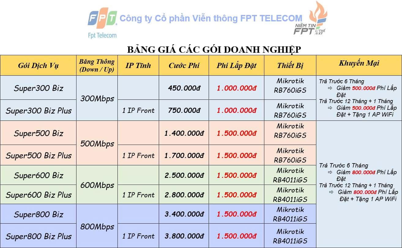 Bất cứ một doanh nghiệp, tổ chức nào cũng cần sử dụng một đường truyền Internet cáp quang ổn định, tốc độ nhanh chóng cùng một mức phí phù hợp. Thấu hiểu điều đó, FPT Telecom mang đến các gói cước cáp quang tốc độ cao dành cho doanh nghiệp sử dụng từ 30 thiết bị, tốc độ truy cập từ 300Mbps -> 800 Mbps.